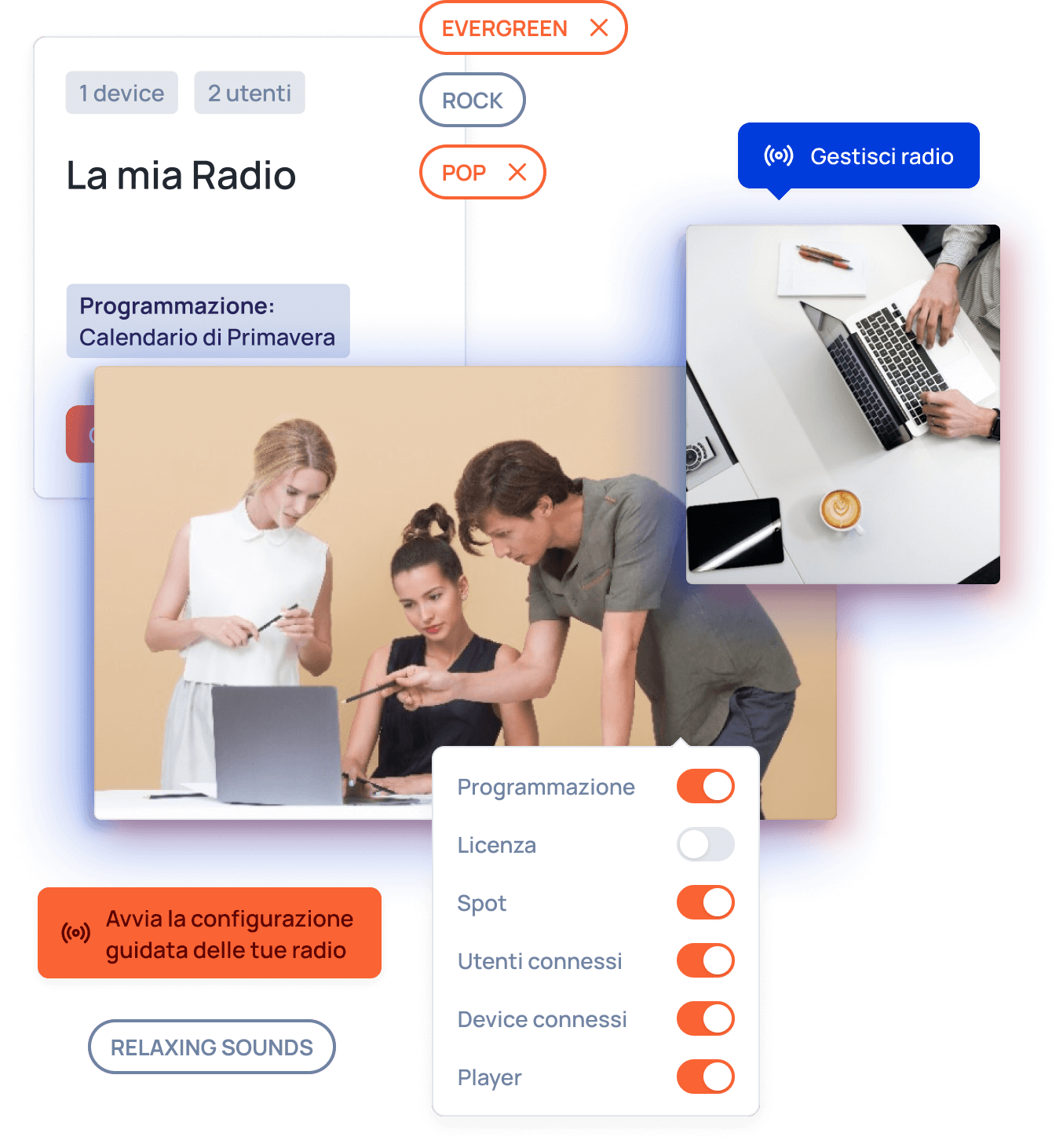 Migliora il tuo ambiente di lavoro con una radio personalizzata, distinguiti dalla concorrenza con Musica legale compresa di tutti i diritti e Spot custom… stai senza pensieri con MoosBox!